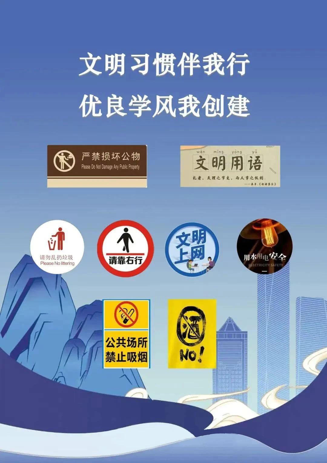 请自觉爱护校园公共环境,切实杜绝在公共场所抽烟现象,不乱扔垃圾、不随地吐痰、不破坏公物,维护教室卫生,不在墙面、桌面等公共设施上随意刻画、涂鸦,展现大学生良好形象。