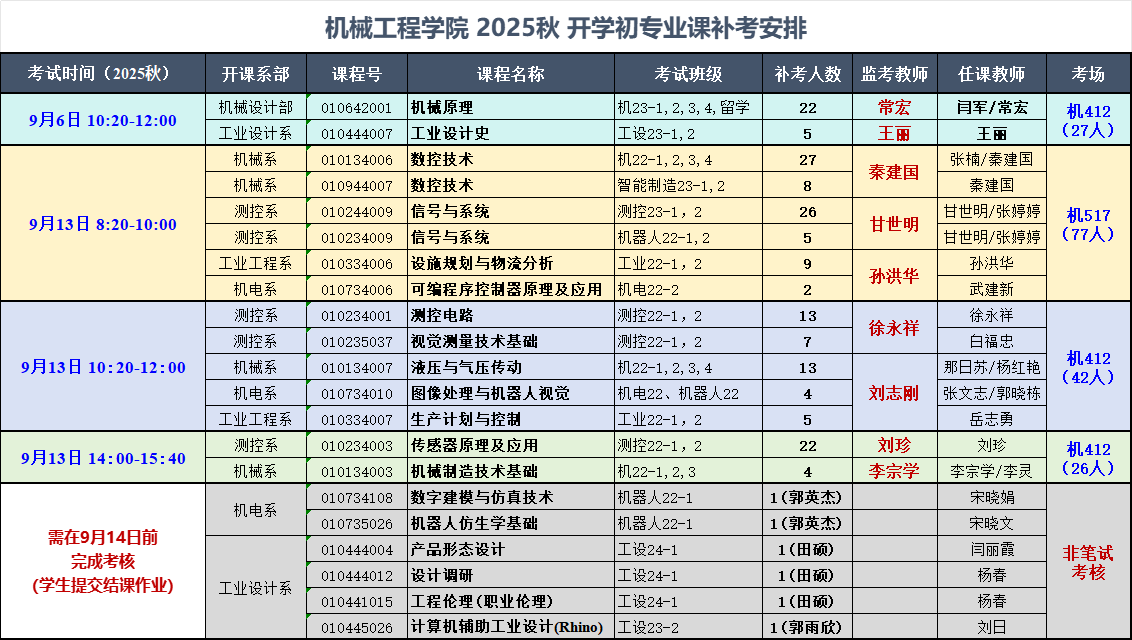 2007so太阳集团所有专业的专业课补考(含缓考)安排在2025年9月6~13日进行,具体安排见下表所示。