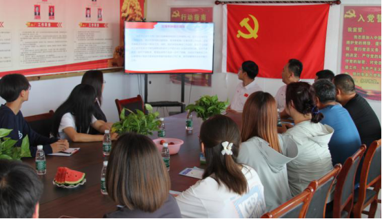 ▲第一书记在党群服务中心向团队介绍九号村情况