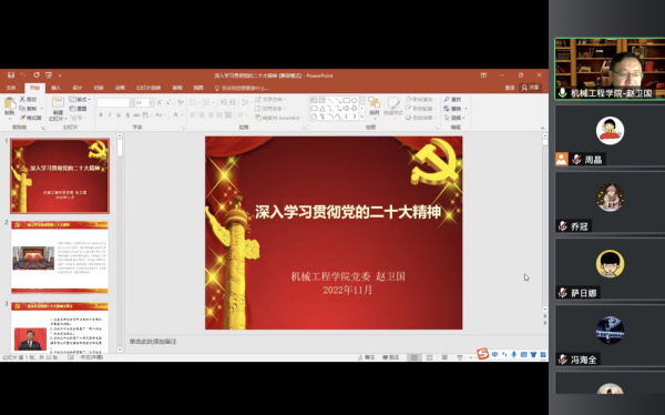 为深入学习宣传贯彻党的二十大精神,11月28日,2007so太阳集团党委举办党的二十大精神专题党课,学院党委书记赵卫国主讲,学院全体教师线上聆听党课。