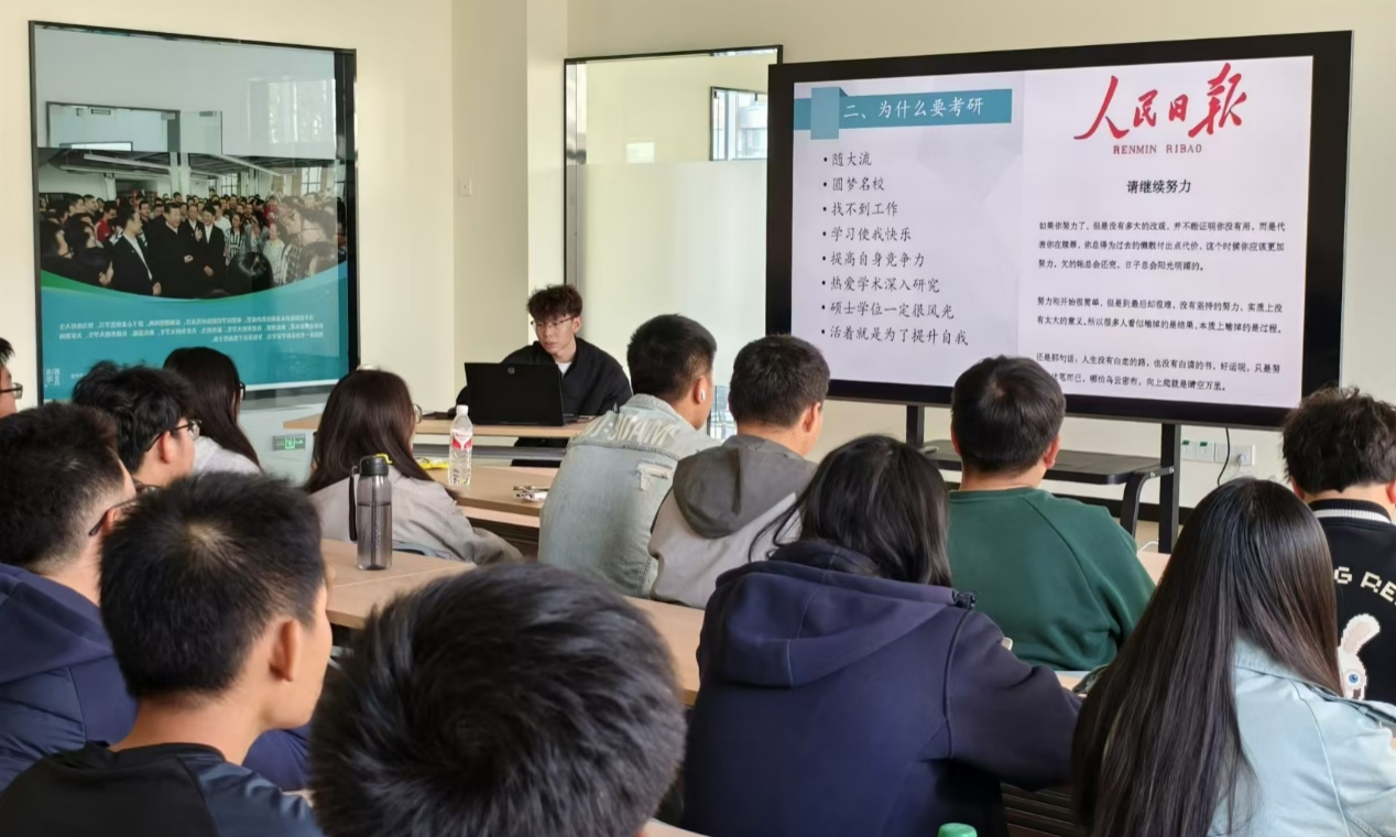 分享会上,首先发言的是侯艳博学长,他主要分享了自己的考研经历,并向同学们介绍了考研常识和自己在各科上的学习方法和学习计划。同时,学长结合自身经验给在座的同学们提出高效有力的学习方法。最后他鼓励同学们继续努力,因为努力向上爬必会有不一样的收获。