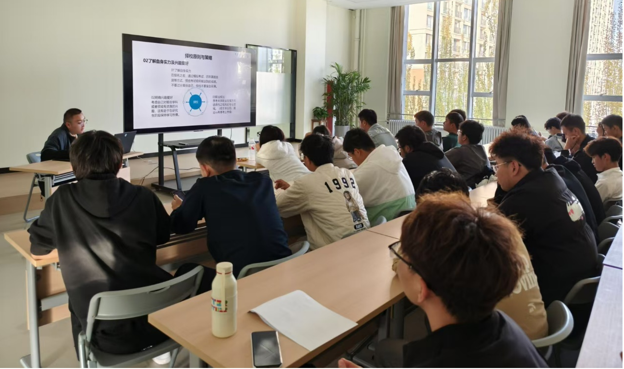 接着,姚广伟学长则对自己的考研经验进行分享,他向同学们讲述了择校原则与策略、考研的信息收集与筛选、复试经验分享。让同学们认识到了解自身实力,明确个人兴趣爱好的重要性,也要对自己的职业和未来发展方向有一个深刻的认识。最后结合自己的复试经验来告诉同学们提升专业能力,掌握本科核心知识是非常重要的。